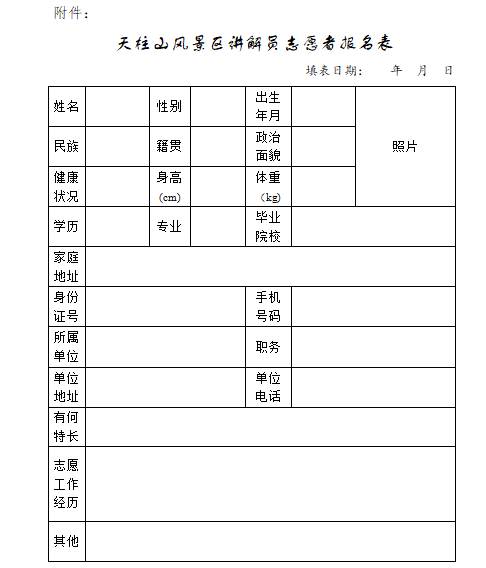 ? ? ? ? 1.《天柱山風(fēng)景區(qū)講解員志愿者報(bào)名表》(見附件);