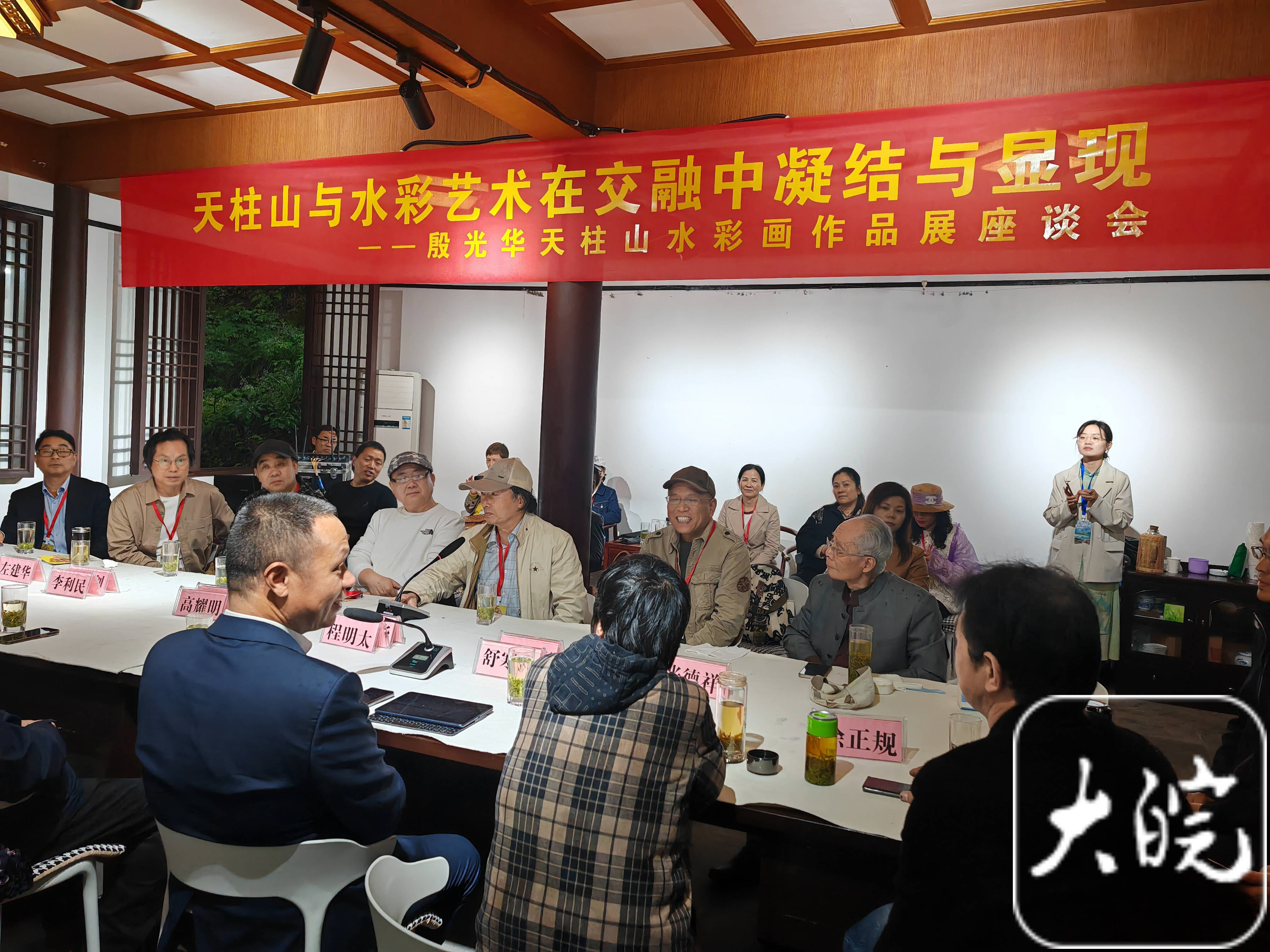 開幕式上,天柱山管委會為殷光華頒發(fā)“天柱山駐山畫家”和“天柱山榮譽(yù)山民”證書,并舉行殷光華天柱山繪畫工作室揭牌儀式。殷光華向天柱山管委會和地質(zhì)公園博物館分別贈送一件作品,并獲贈收藏證書。4日下午,就“天柱山與水彩藝術(shù)在交融中凝結(jié)與顯現(xiàn)”舉行座談。